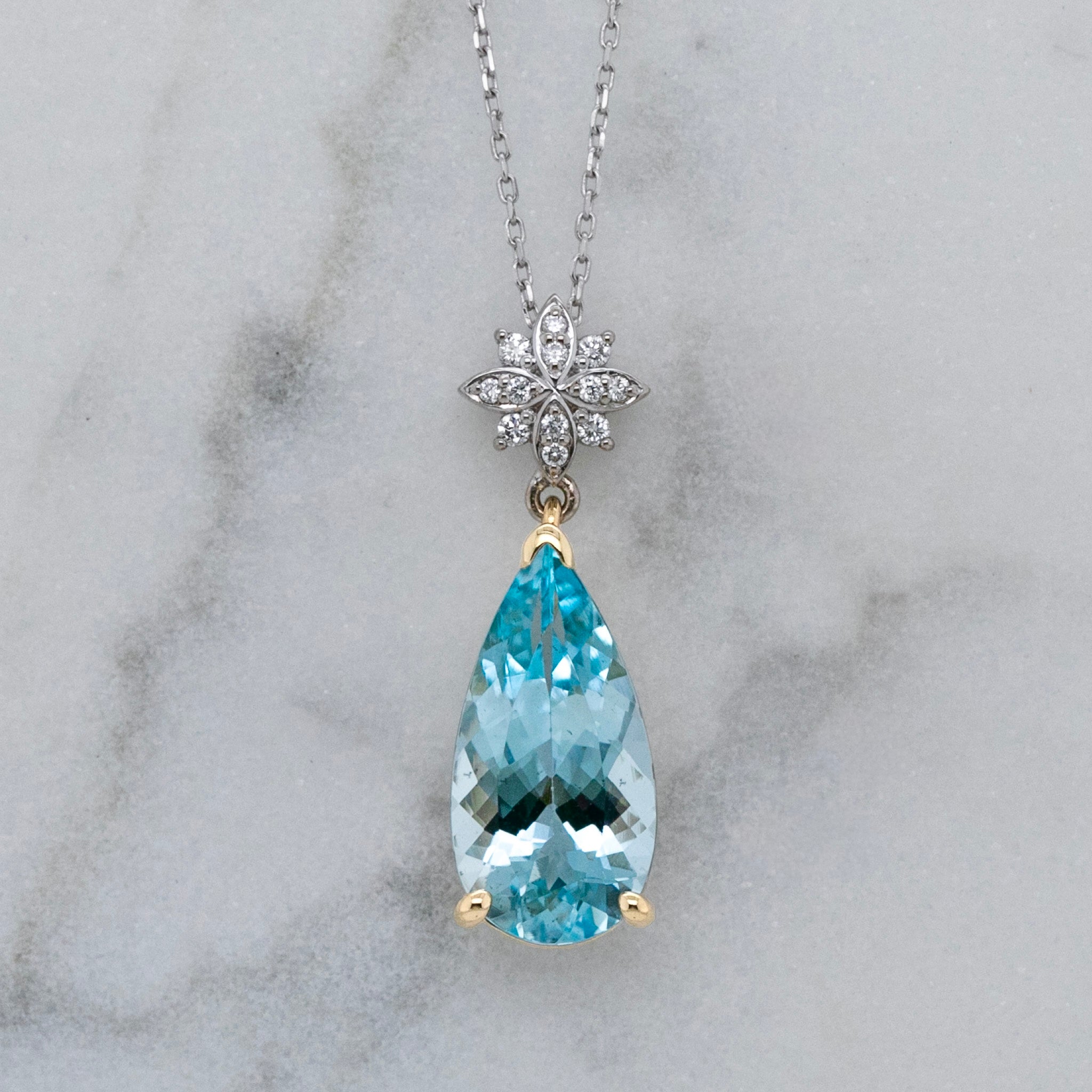 Radiant and eye-catching, this pendant showcases a breathtaking pear-shaped aquamarine, weighing 4.00ct and measuring 15 x 12mm. The cool blue gem is suspended from a delicate starburst design set with 0.10ct of diamonds, adding a subtle brilliance that frames the aquamarine’s natural sparkle.