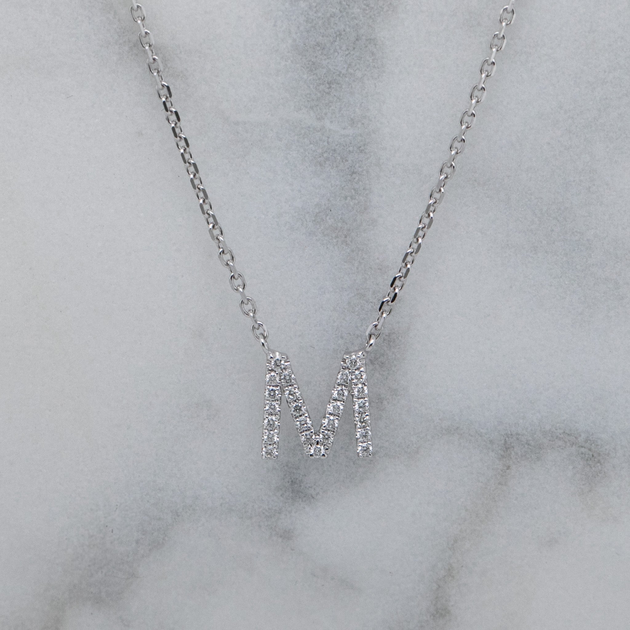 A sparkling celebration of individuality, this necklace features a finely crafted ‘M’ initial pendant set with natural diamonds for a refined touch of brilliance. The diamonds are expertly pavé-set in 18ct white gold, creating a delicate shimmer with every movement.