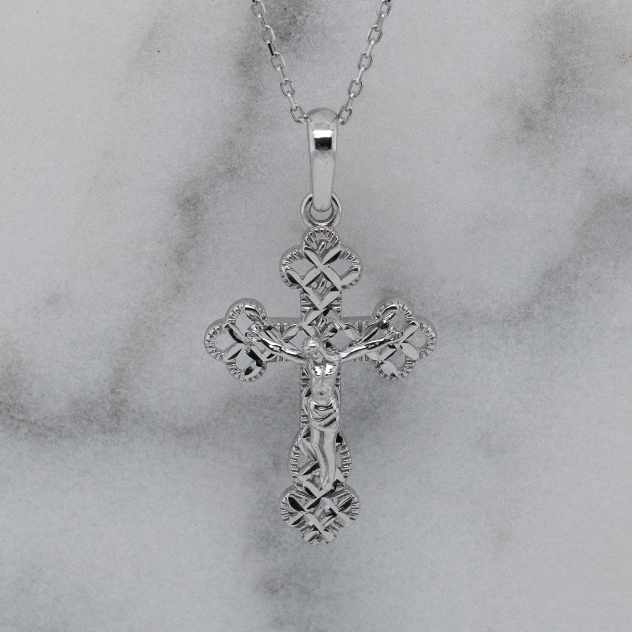 A classic symbol of faith, this Orthodox cross is crafted in 18k white gold, offering timeless elegance and enduring quality. Suspended from a matching 45 cm white gold chain, it’s perfect for daily wear or special occasions.
