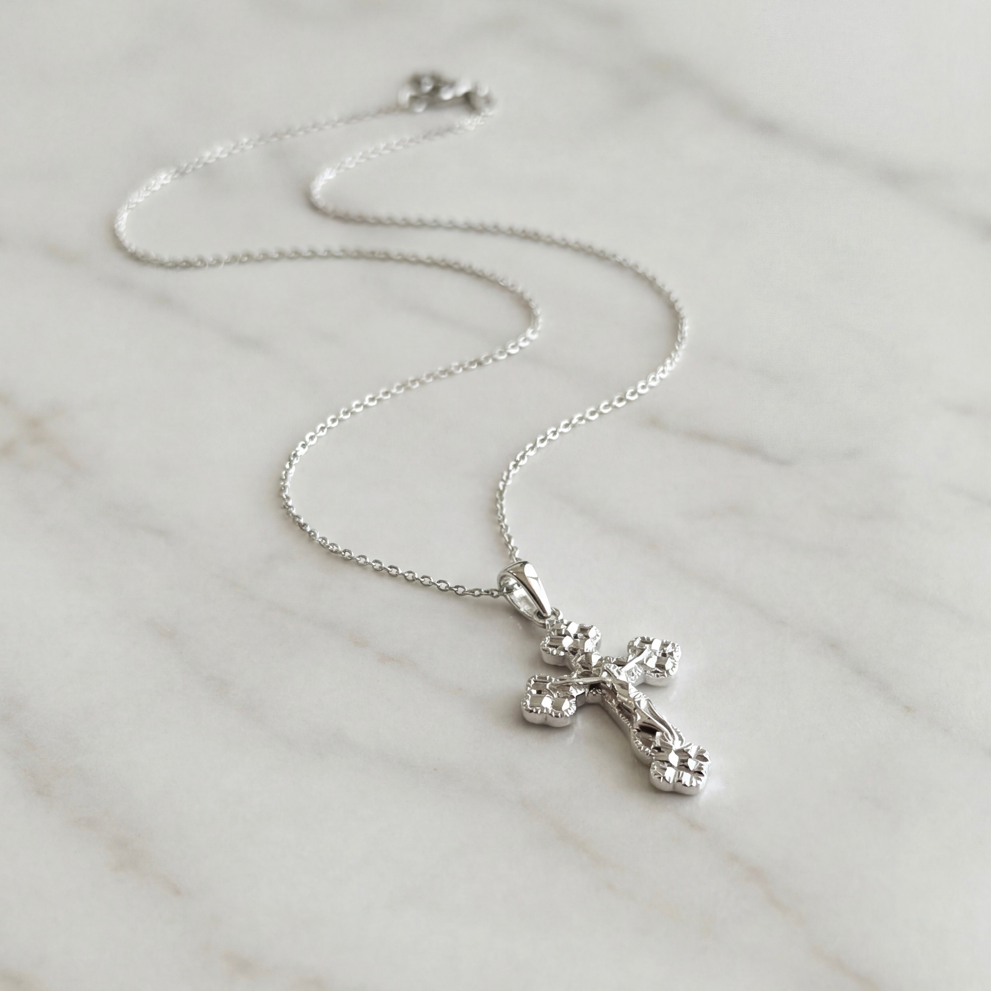 A classic symbol of faith, this Orthodox cross is crafted in 18k white gold, offering timeless elegance and enduring quality. Suspended from a matching 45 cm white gold chain, it’s perfect for daily wear or special occasions.