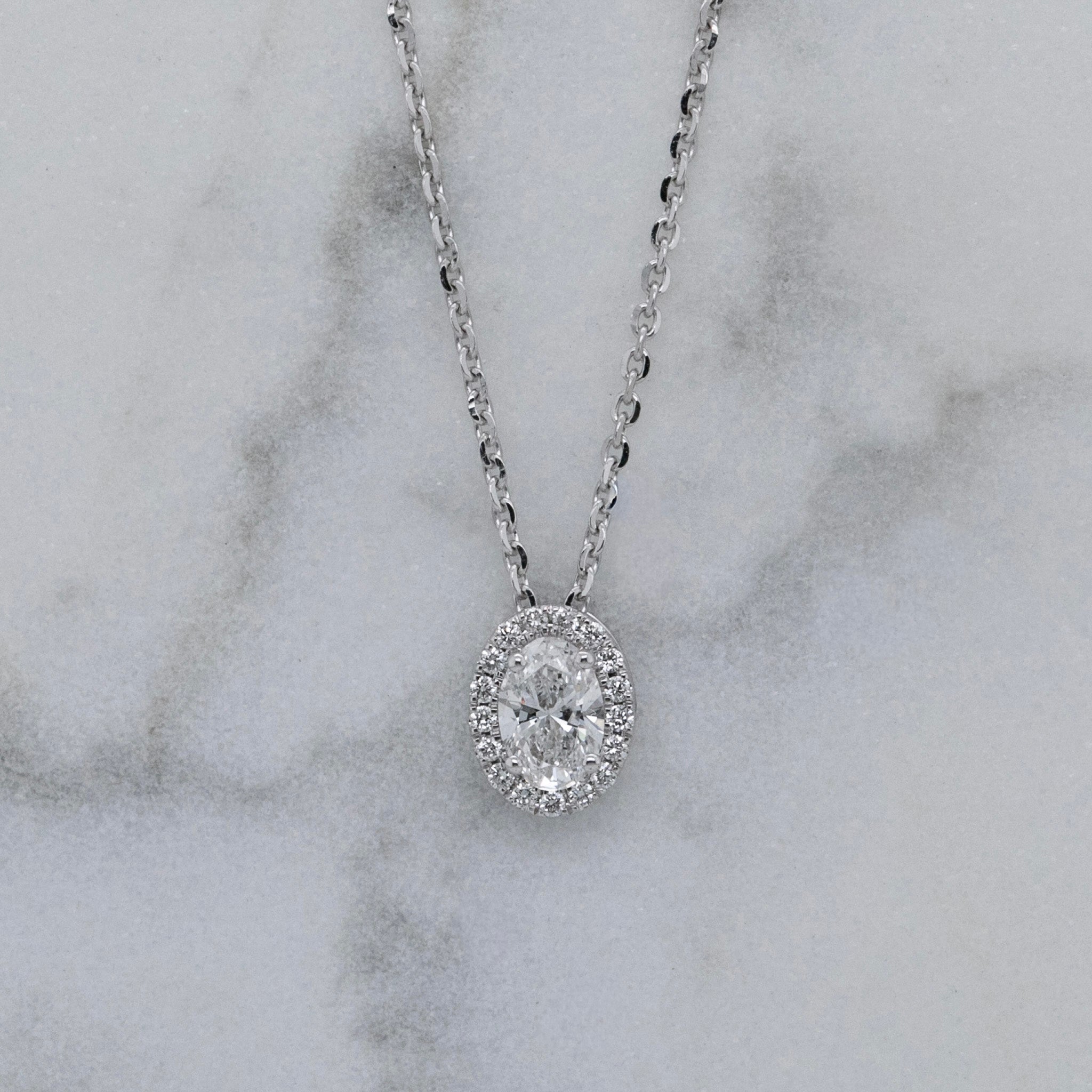 A classic design with timeless brilliance, this pendant features a stunning 0.50ct oval-cut lab grown diamond at its centre, elegantly framed by a halo of round brilliant cut diamonds that enhance its sparkle and presence.