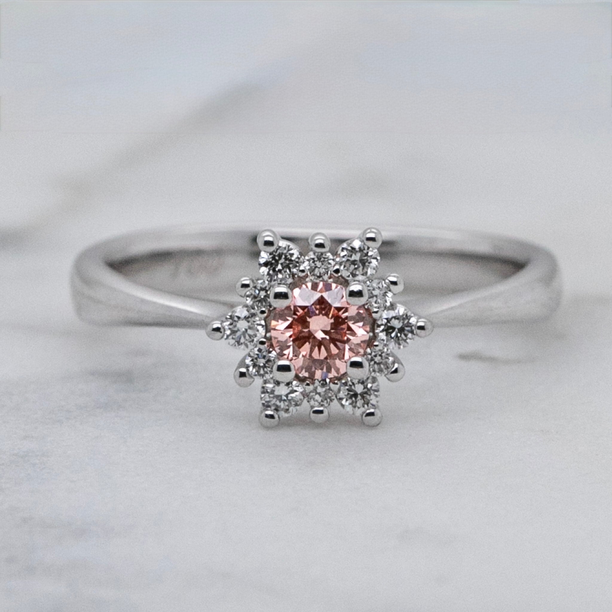 Delicate and radiant, this 18k white gold cluster ring shines with a celestial-inspired design. At its heart rests a vivid pink lab-grown diamond, surrounded by a halo of brilliant white lab-grown diamonds. Together, the 0.40-carat total weight creates a harmonious balance of colour and sparkle.