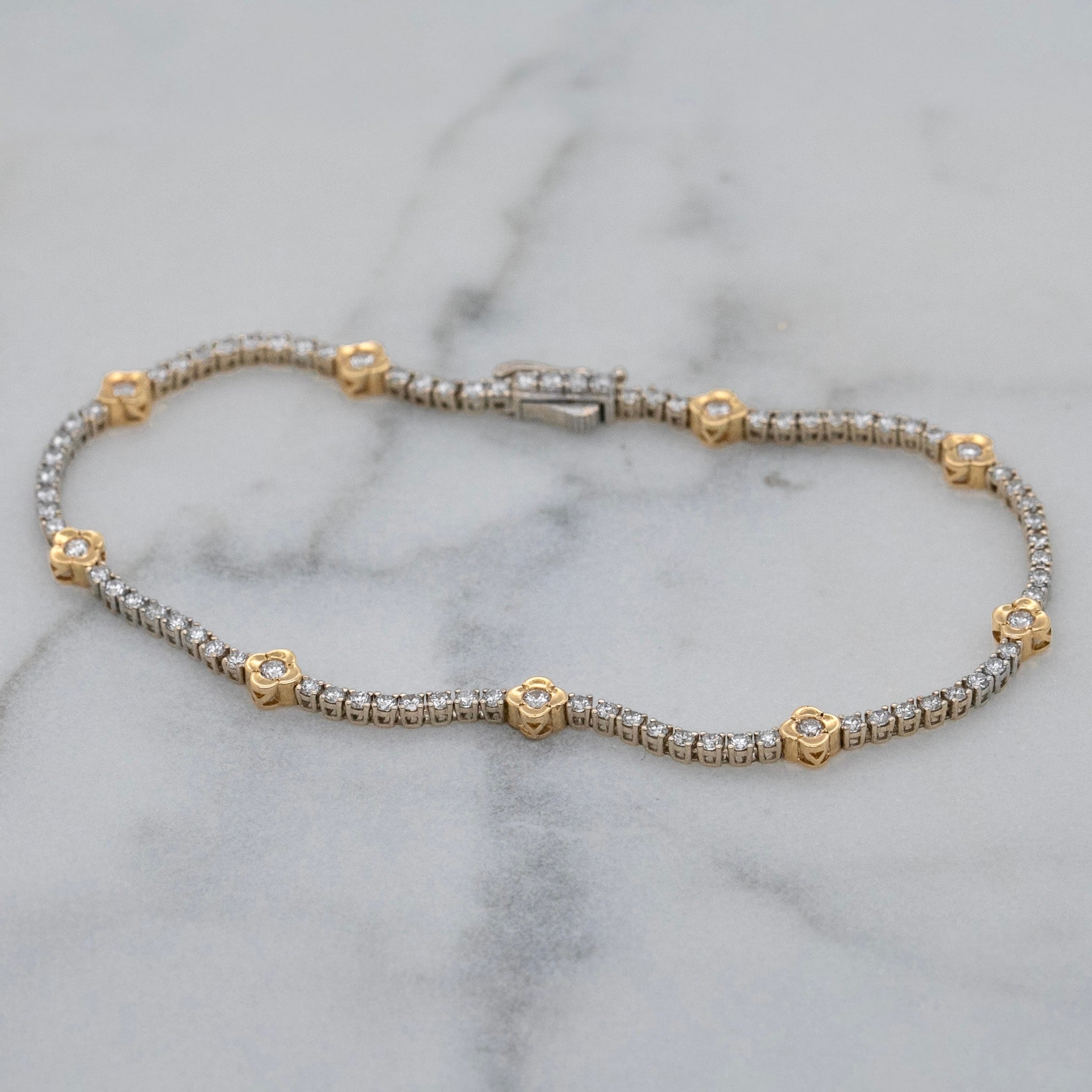 Classic elegance with a touch of charm, this 18k white and yellow gold diamond tennis bracelet is designed to enchant. Set with 84 natural round brilliant-cut diamonds totalling 1.25 carats, the bracelet radiates timeless sparkle and refined sophistication.