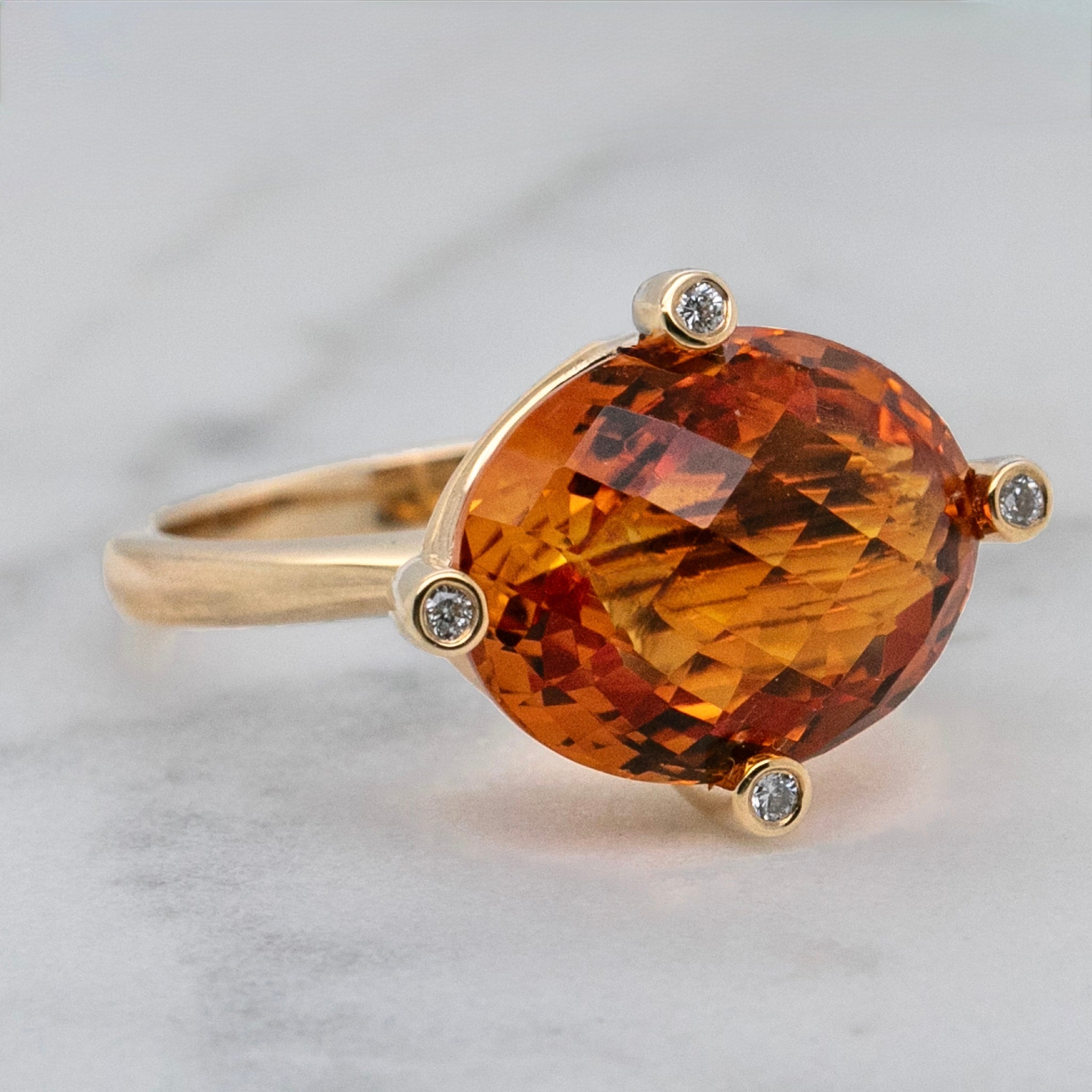 Set in 9ct yellow gold, the stone is secured by elegant claws, each tip adorned with a sparkling diamond accent for a refined touch of brilliance. The combination of golden hues and subtle diamond highlights makes this ring a striking yet sophisticated choice for evening wear or special occasions.