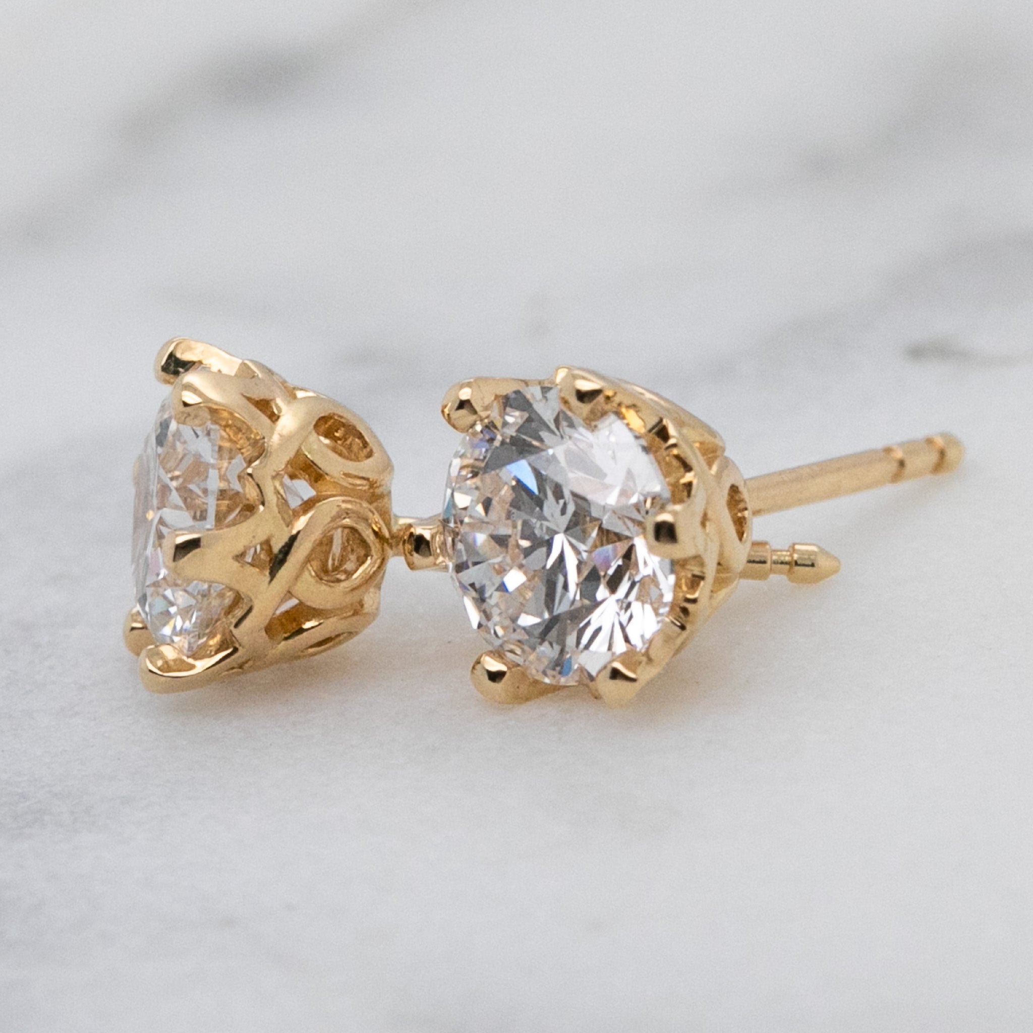 A breathtaking blend of timeless elegance and exceptional craftsmanship, these 18k yellow gold vintage-style diamond stud earrings showcase an extraordinary level of brilliance and refinement. Each earring features a round lab-grown diamond, totalling an impressive 2.00ct, graded D colour and VVS2 clarity—a premium combination that ensures unmatched sparkle and purity.