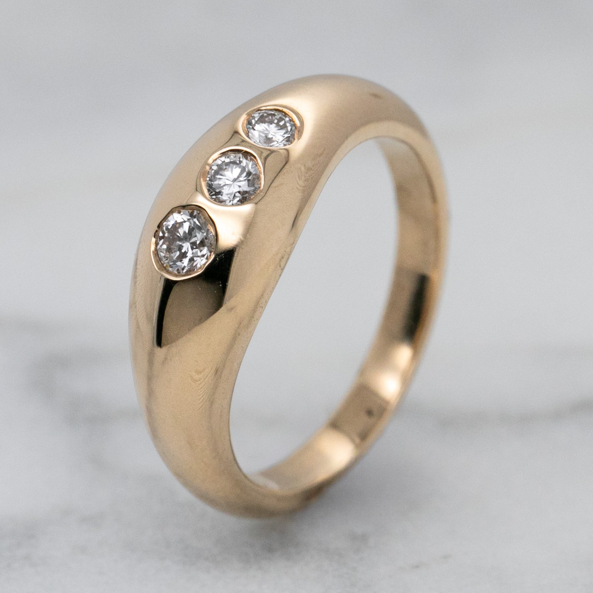Bold, modern, and effortlessly luxurious, this 9k yellow gold diamond dome ring makes a striking statement with its sculptural silhouette and radiant sparkle. Three round lab-grown diamonds, totalling 0.25ct, are elegantly set into the curved dome, adding brilliance that contrasts beautifully against the warm, polished gold.