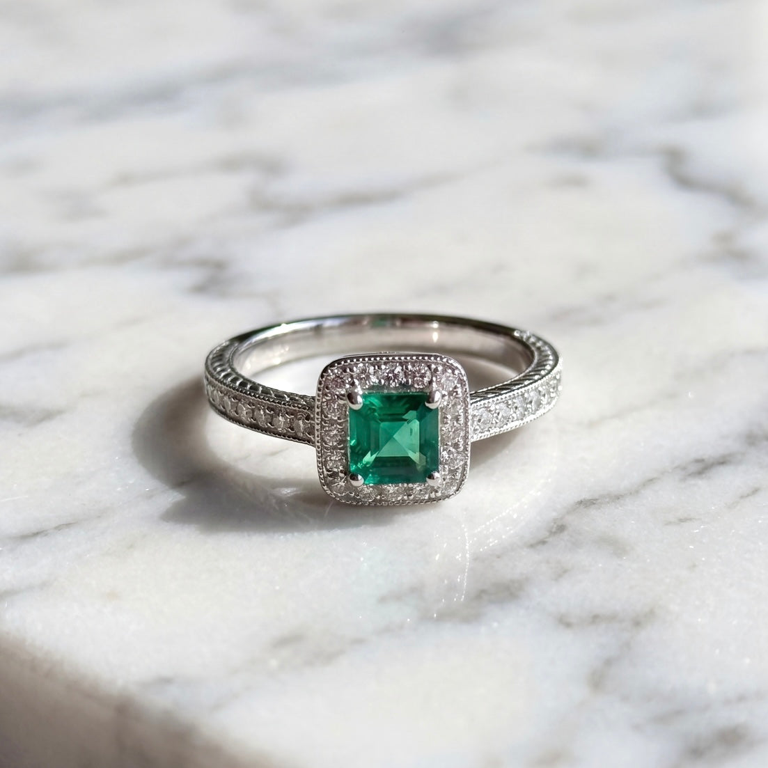 Bold yet refined, this striking cocktail ring is crafted in 18k white gold and centred with a beautifully cut Asscher emerald weighing 0.40ct. The emerald’s crisp facets and rich green hue give the ring a sophisticated geometric character, while natural diamonds totalling 0.20ct add a delicate brilliance that enhances the design.
