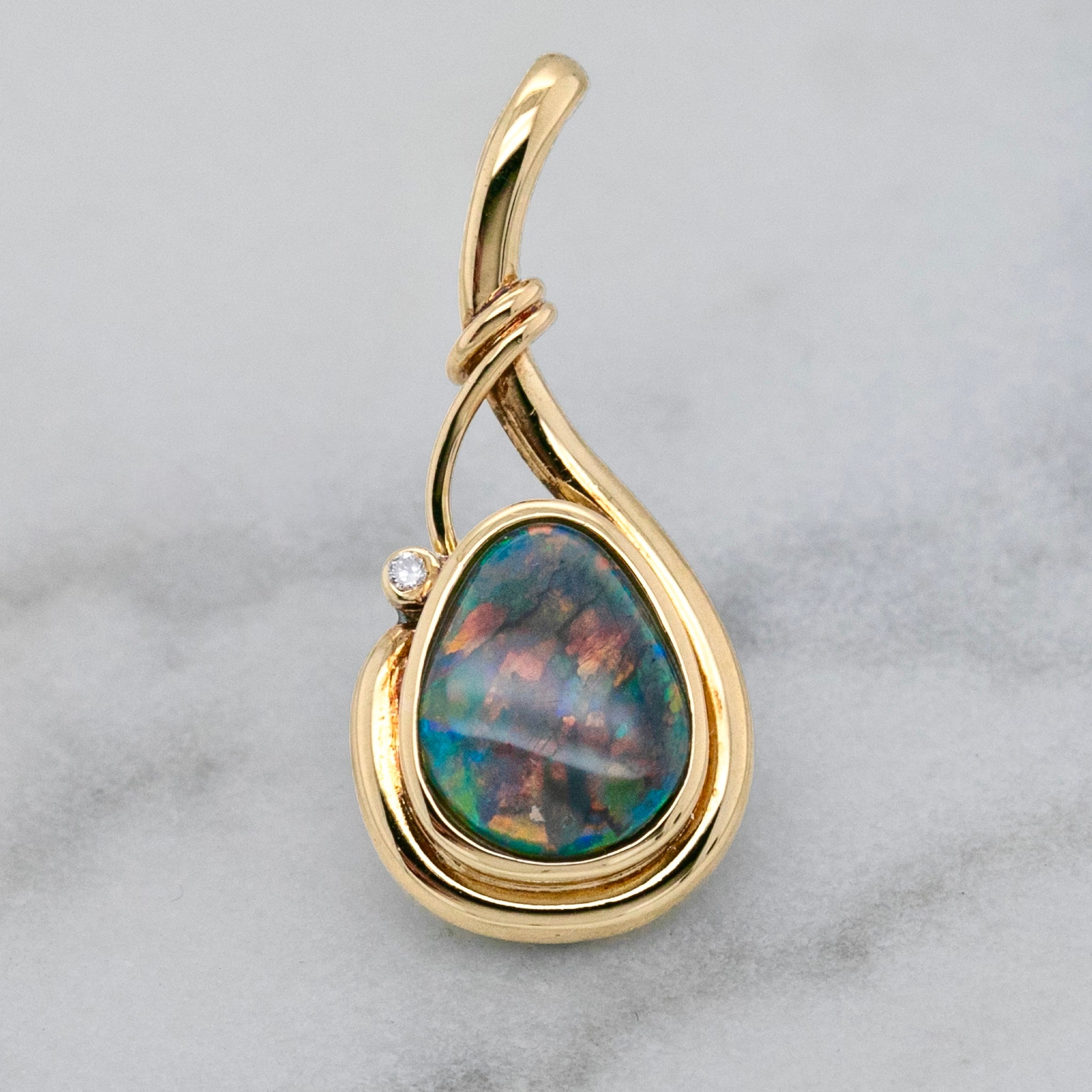 This elegant pendant highlights the beauty of a freeform Australian opal (10 x 7mm) with a striking harlequin pattern, alive with vibrant flashes of colour. The opal is set within a long swirling design of 18ct yellow gold, creating a graceful sense of movement. A single natural diamond accent (0.01ct) provides just the right amount of sparkle, complementing the opal’s natural play of light.