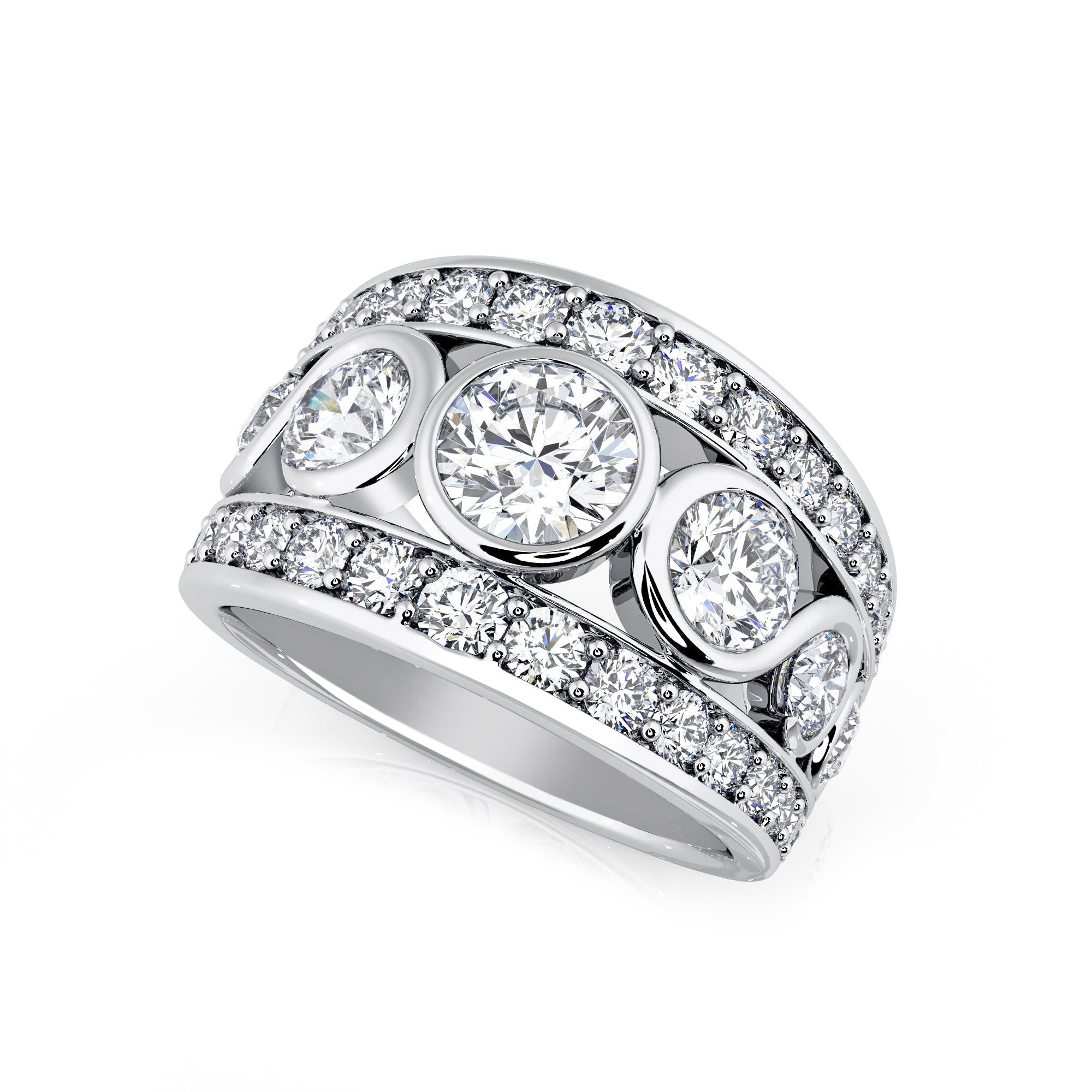 Show off your love of diamonds with this fabulous 3 row diamond dress ring. Featuring over 3.50 carats of bezel set round brilliant cut diamonds, this ring sparkles from every direction.