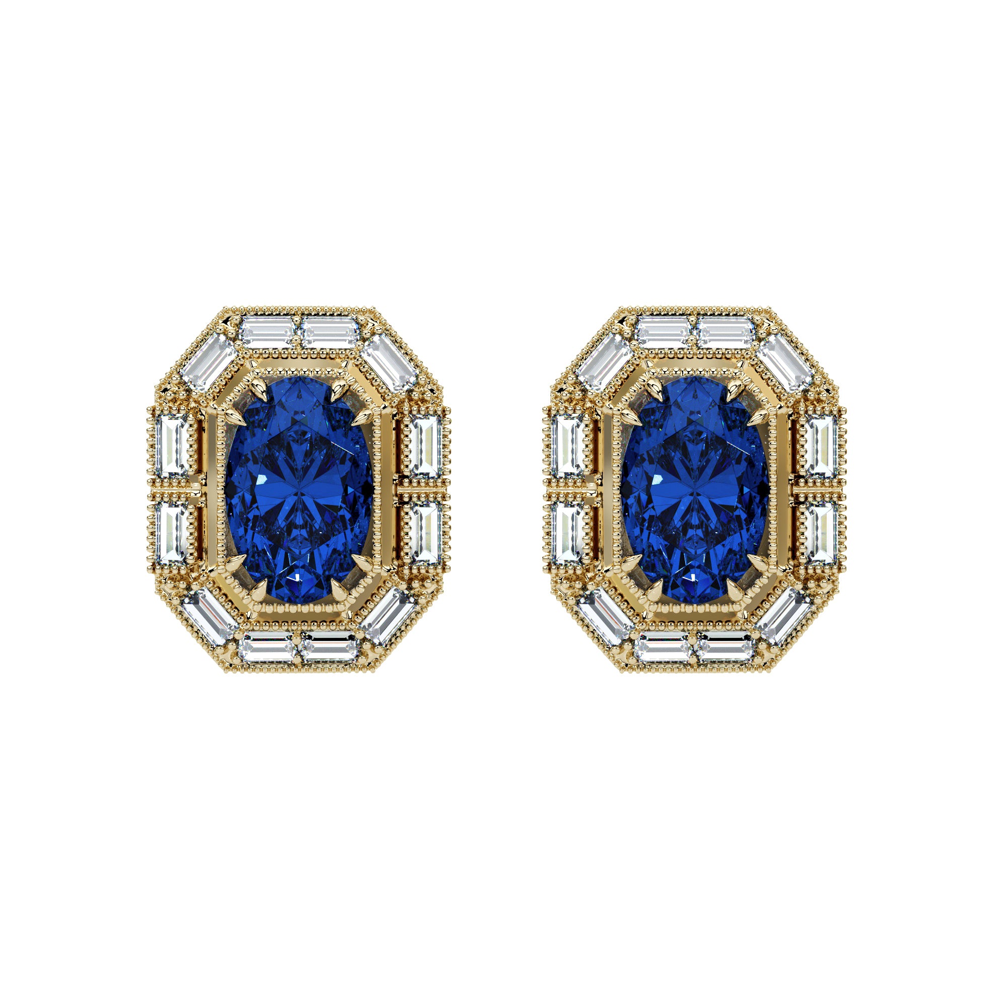 Step back in time with these Art-deco style sapphire and diamond halo stud earrings. The vibrant oval sapphires are surrounded by a halo of dazzling baguette diamonds, expertly crafted in yellow gold to showcase the beauty of each individual stone. The attention to detail is evident in the milgrain edge finish, adding a touch of refinement to the overall design. Highly sought after for their timeless elegance, these earrings are a luxurious addition to any outfit.