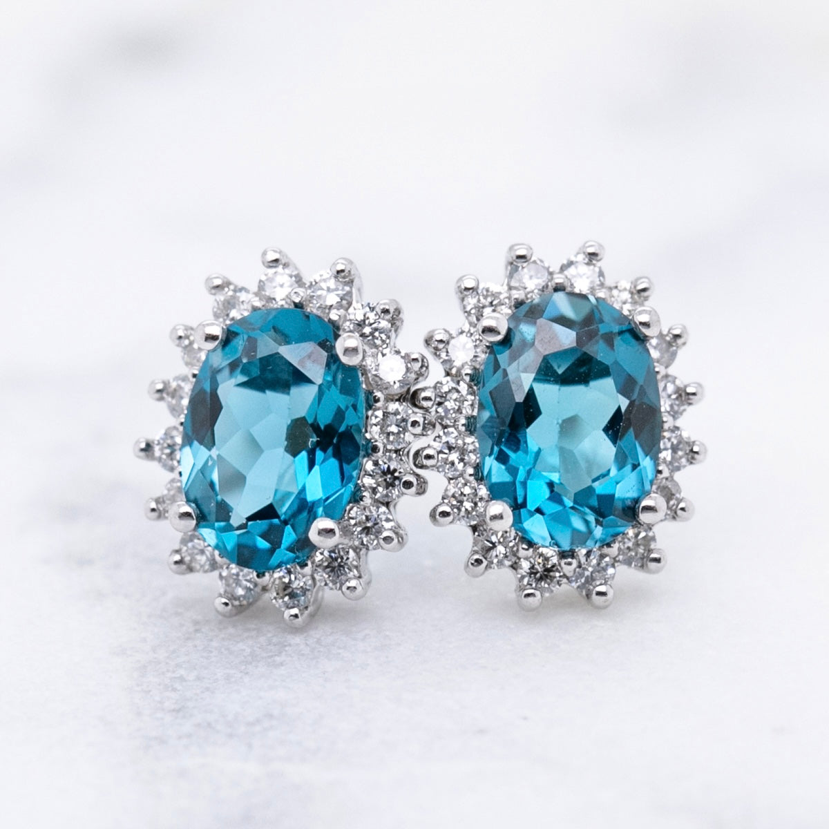 Introducing our Blue Topaz and Diamond Halo Stud Earrings, featuring 18k white gold, 2 London Blue Topaz stones totaling 3.00ct, and 32 natural diamonds totaling 0.25ct. Add a touch of elegance and sparkle to any outfit with this stunning and timeless piece of jewellery.
