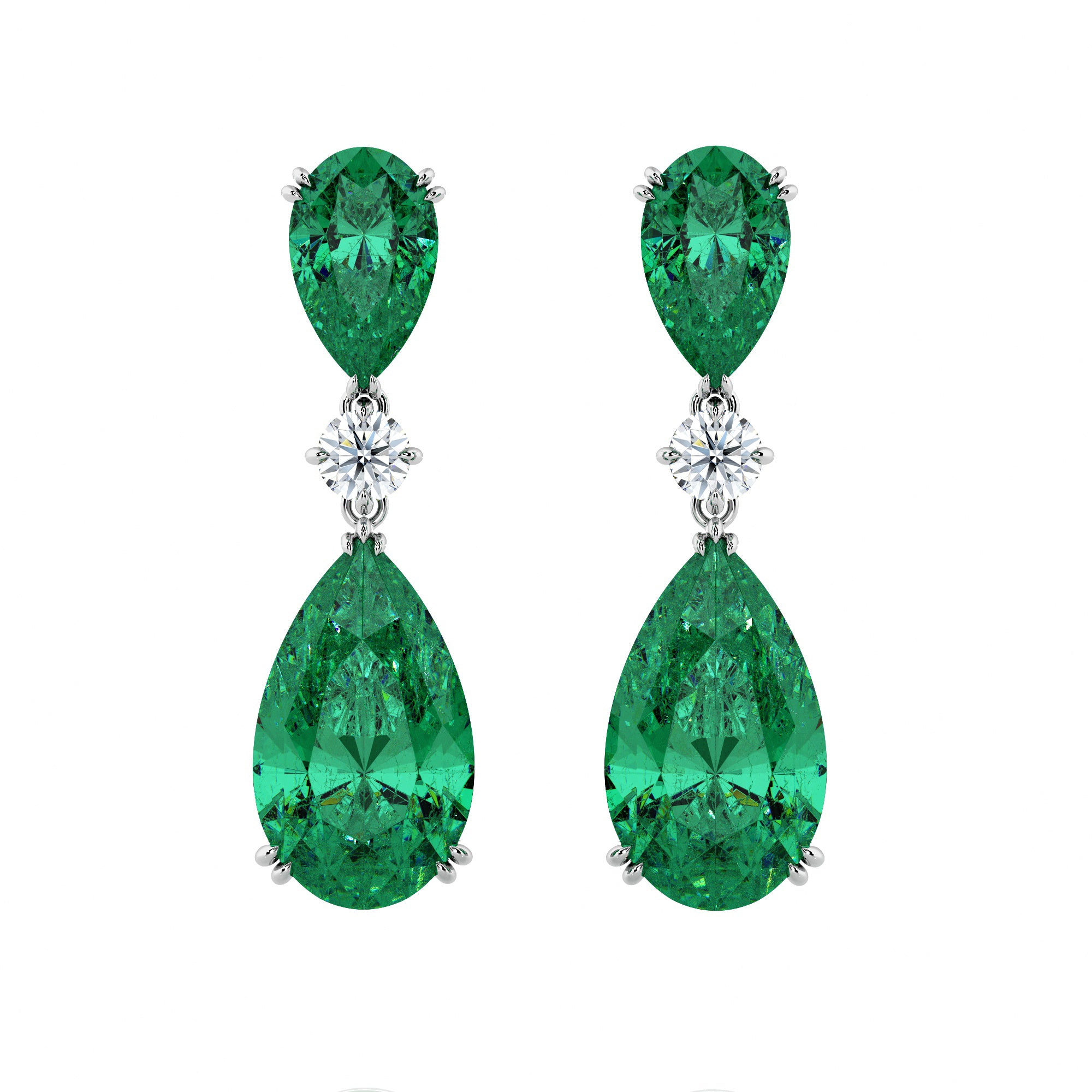 Embrace the allure of rare beauty and timeless glamour with our Pear Shaped Emerald and Diamond Drop Earrings. Expertly claw set, each earring showcases the radiance of two exquisite pear-shaped emeralds delicately embraced by a single round diamond. Crafted with meticulous precision, these earrings effortlessly exude opulence and grace, making them the perfect addition to any luxurious ensemble.