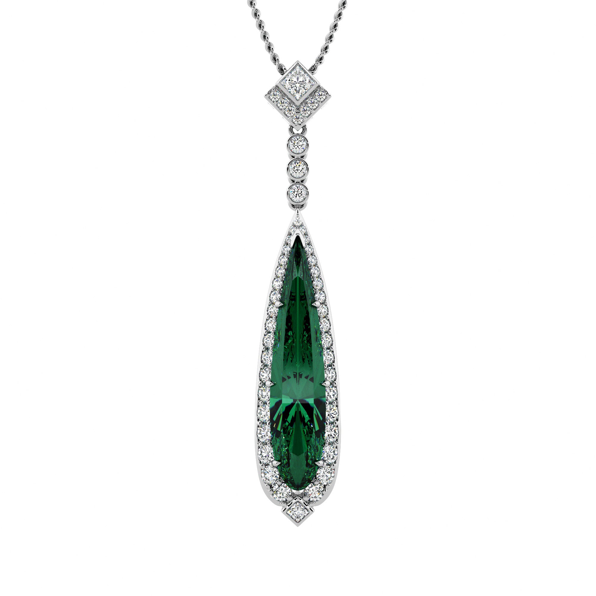Exuding a subtly luxurious charm in deep green, this remarkable pendant features a 1.40ct elongated teardrop tourmaline surrounded by a glistening halo of diamonds. An Art-Deco inspired diamond studded bale lends a stylish touch.