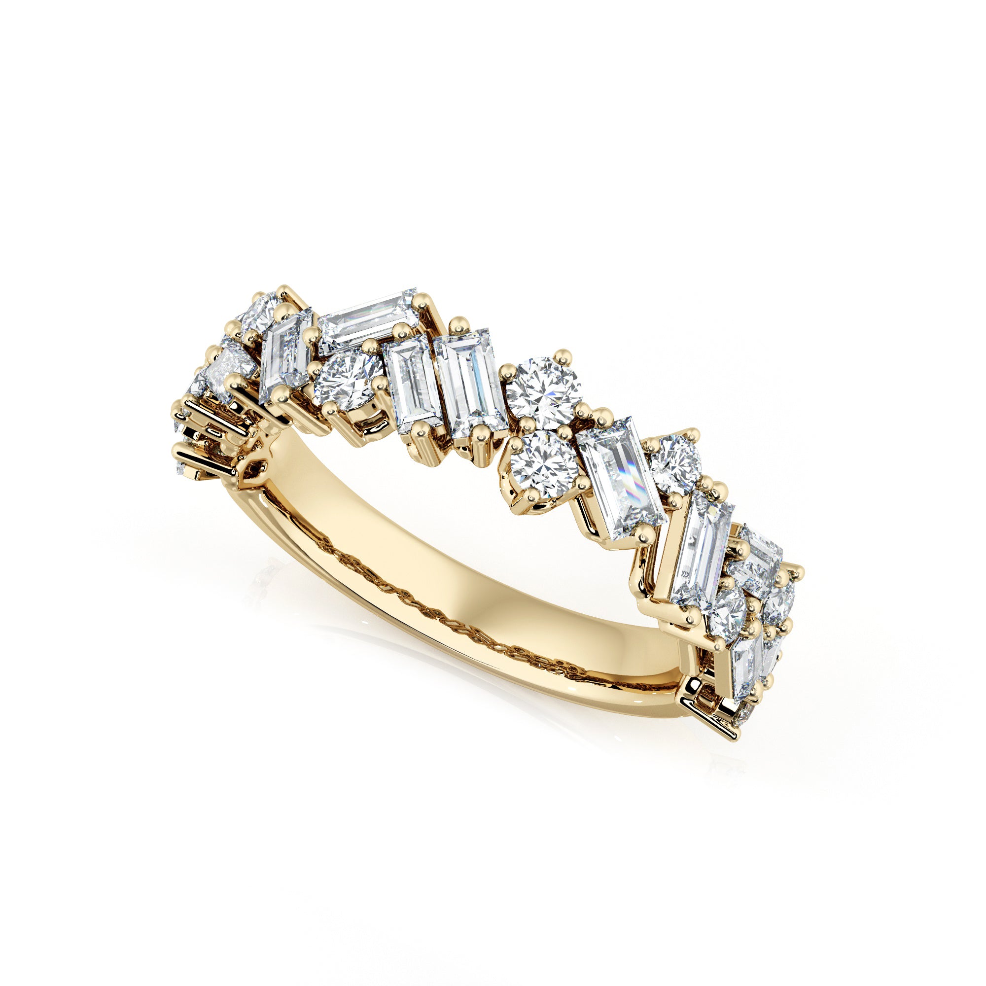 Indulge your contemporary style with this striking baguette and round diamond dress ring. Set in yellow gold, this gorgeous diamond band is accented with a mesmerizing array of round and baguette-cut diamonds that radiate modern flair. Whether you're celebrating a milestone or adding to your collection, this edgy masterpiece is an ideal birthday gift for any fashion-forward woman.