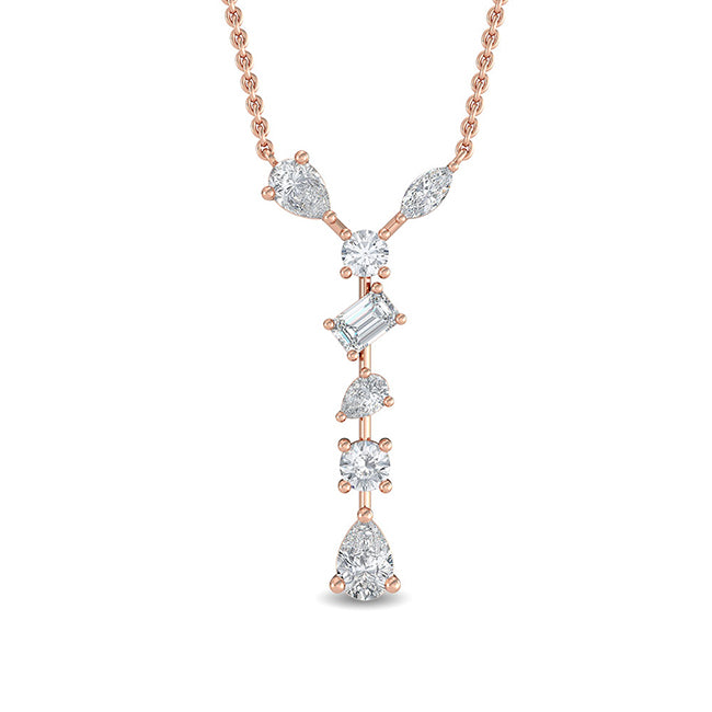Immerse yourself in the charm of our Multi Shape Diamond Drop Necklace. This enchanting piece features a show-stopping combination of pear, emerald, round and marquise cut diamonds. They gracefully cascade down the necklace, creating a shimmering waterfall of light and beauty. This necklace is an excellent choice for those with a flair for alternative design.