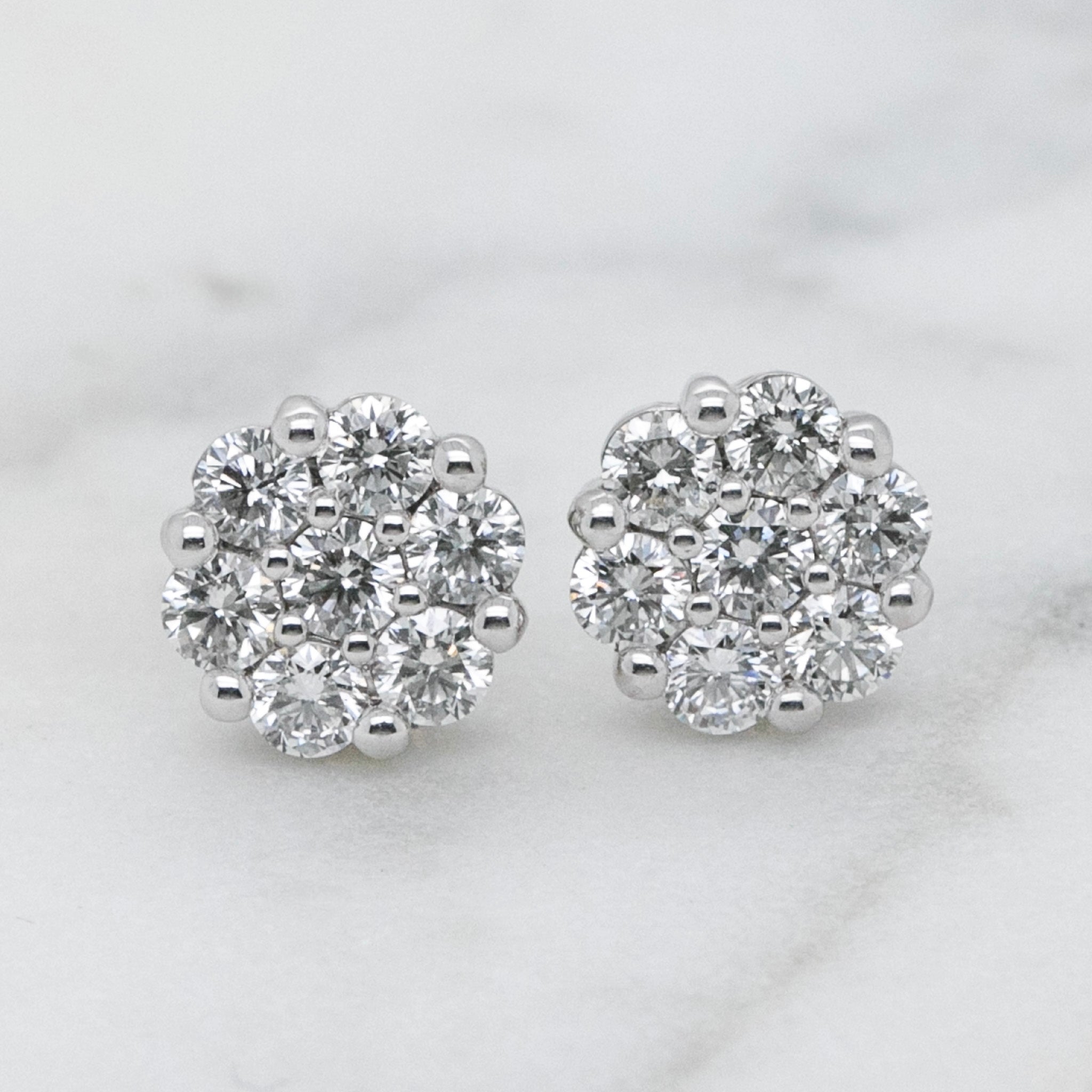 Elegant and timeless, these 18k white gold diamond cluster stud earrings offer a classic floral-inspired design with brilliant sparkle. Each earring features seven carefully selected natural diamonds—14 in total—arranged in a graceful cluster that mimics the soft beauty of a blooming flower.