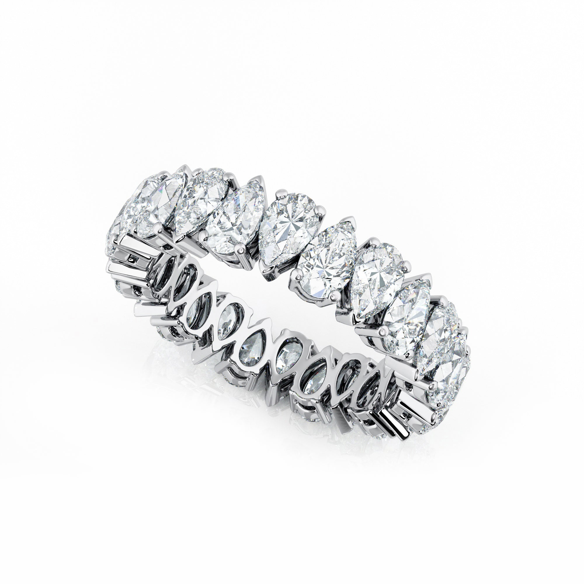 Our pear cut diamond eternity band is an exquisite piece of jewellery that exudes opulence and elegance. Skillfully crafted with precision, this magnificent ring features a series of perfectly proportioned pear cut diamonds totalling 3.50 carats, each expertly claw set in a stunning alternating pattern that creates a mesmerizing wave-like effect. This breathtaking piece is a testament to your everlasting love, making it the perfect gift for your loved one on a special occasion, such as a wedding anniversary or milestone celebration.