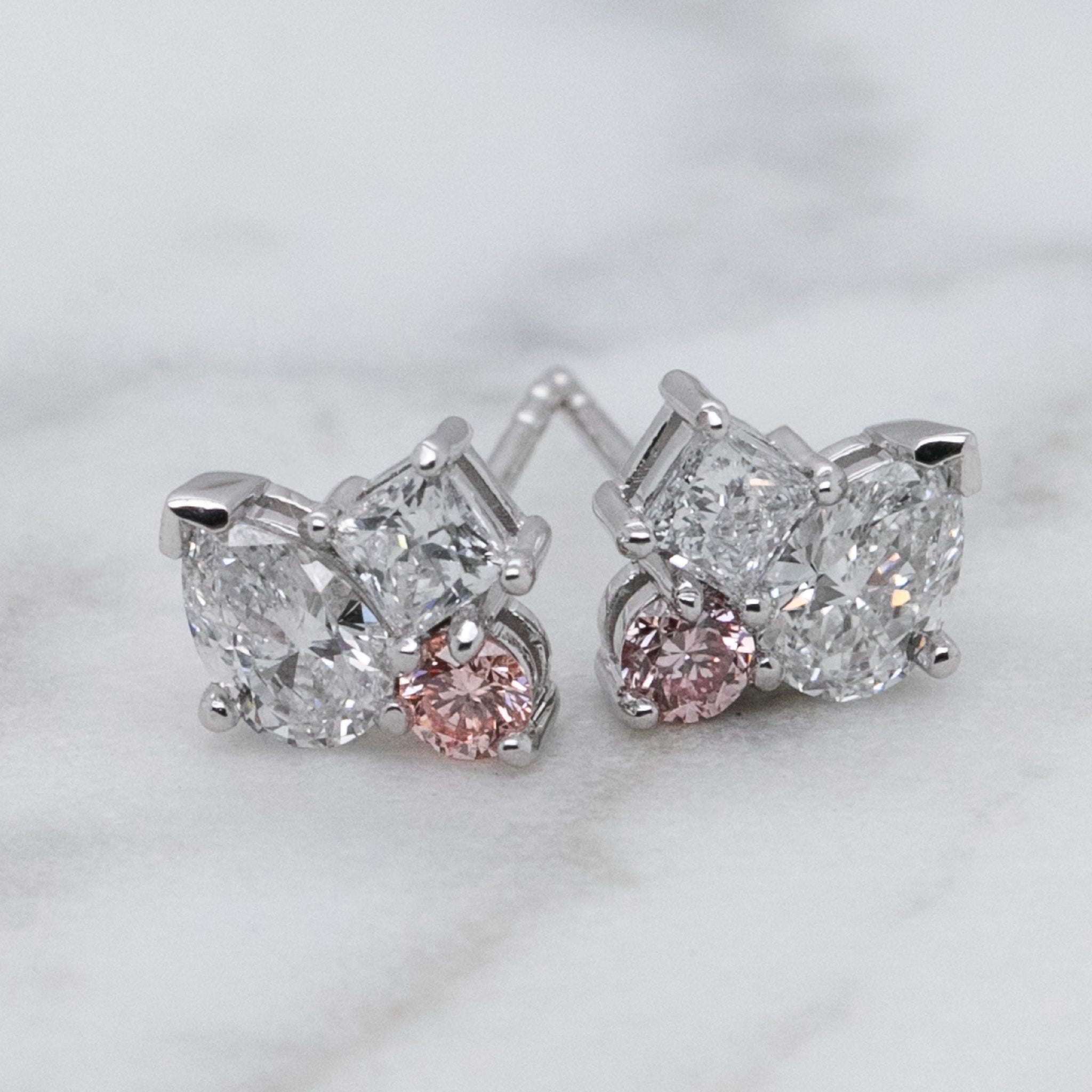 Elegant and contemporary, these mixed-shape diamond earrings showcase a harmonious blend of blush and brilliance. Crafted in 18ct white gold, each earring features a curated arrangement of lab-grown pink diamonds and lab-grown white diamonds, cut in a variety of shapes to create visual intrigue and dynamic sparkle. With a total diamond weight of 1.05ct, the soft pink tones add a romantic warmth, while the white diamonds provide a crisp, radiant contrast.