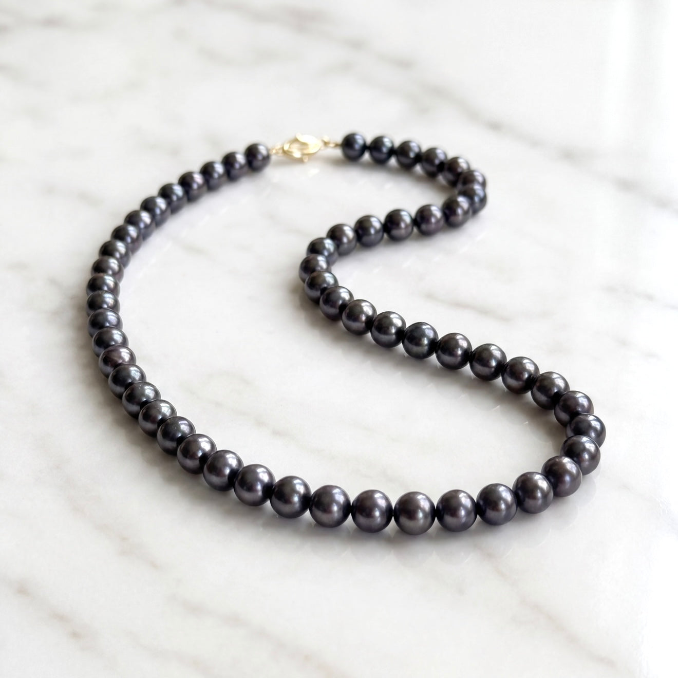 Elegant and distinctive, this purple freshwater pearl necklace offers a beautiful take on a timeless classic. The rich lustre of the pearls is enhanced by their soft purple tone, creating a piece that feels both refined and individual. Finished with a 14k yellow gold clasp, it brings a warm contrast to the cool iridescence of the pearls.