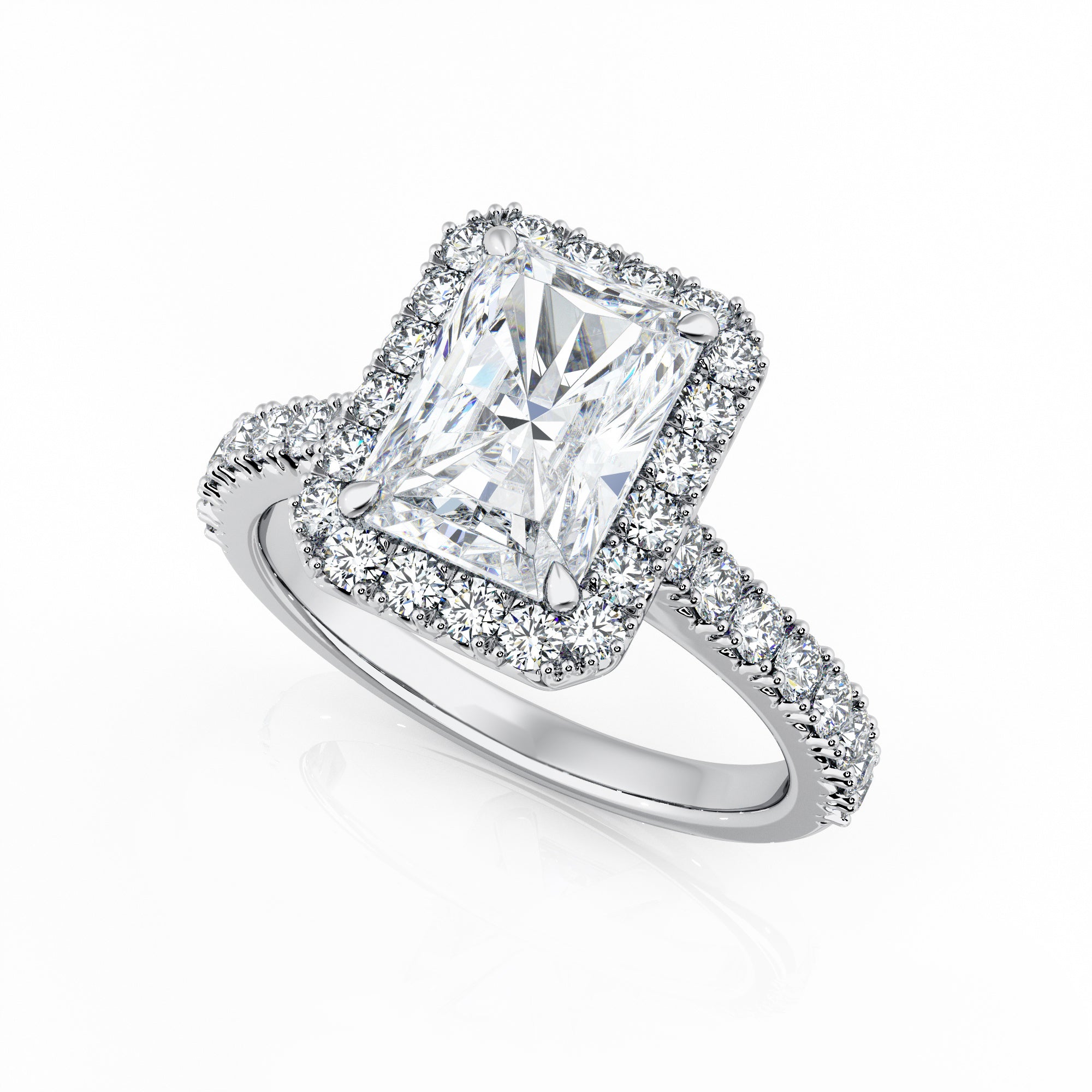 A dazzling 2.00 carat radiant cut diamond is surrounded by a halo of smaller diamonds in this gorgeous engagement ring. Crafted with love and precision, it's the perfect combination of glamour and timeless beauty.
