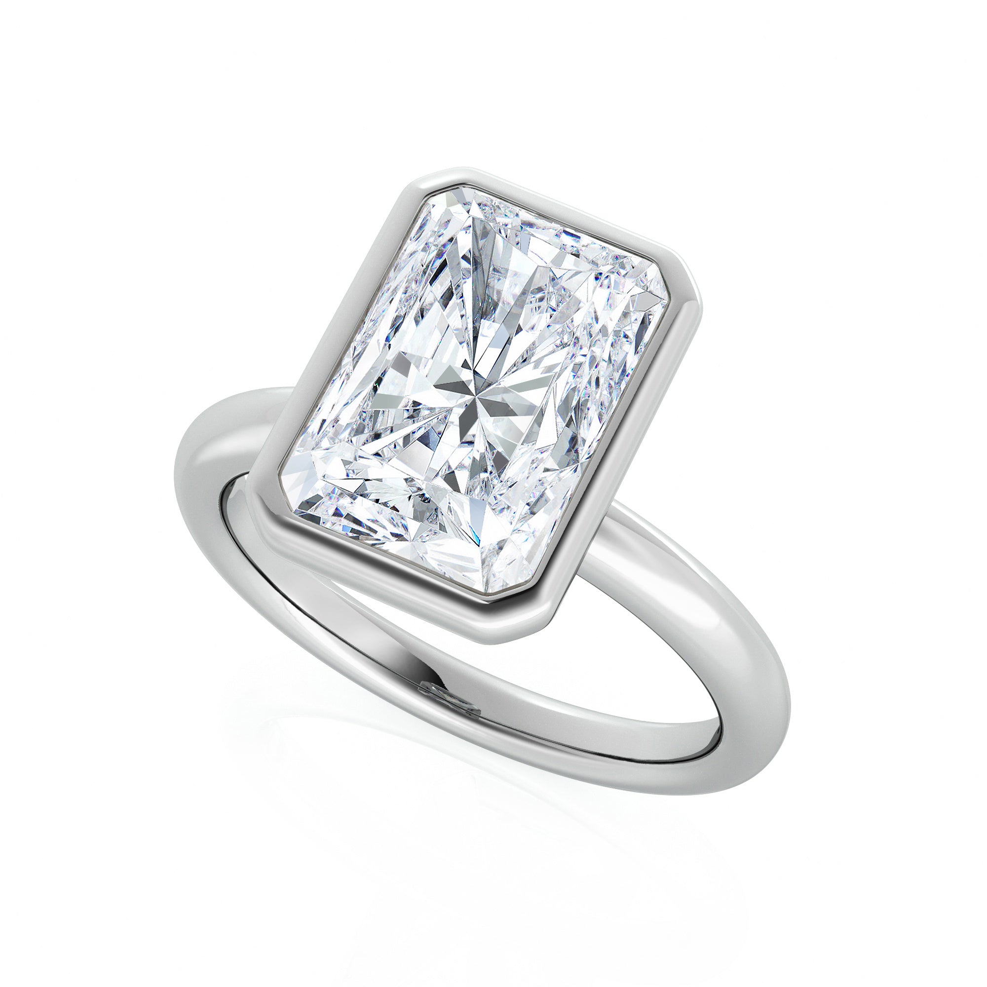 Set with a breathtaking radiant cut natural diamond, this ring is designed to maximise sparkle through the signature radiant cut faceting — combining the crisp structure of an emerald cut with the dazzling fire of a brilliant cut. Encased in a sleek bezel setting, the diamond is framed with smooth precious metal for a sophisticated, contemporary finish, while offering added protection ideal for everyday wear.