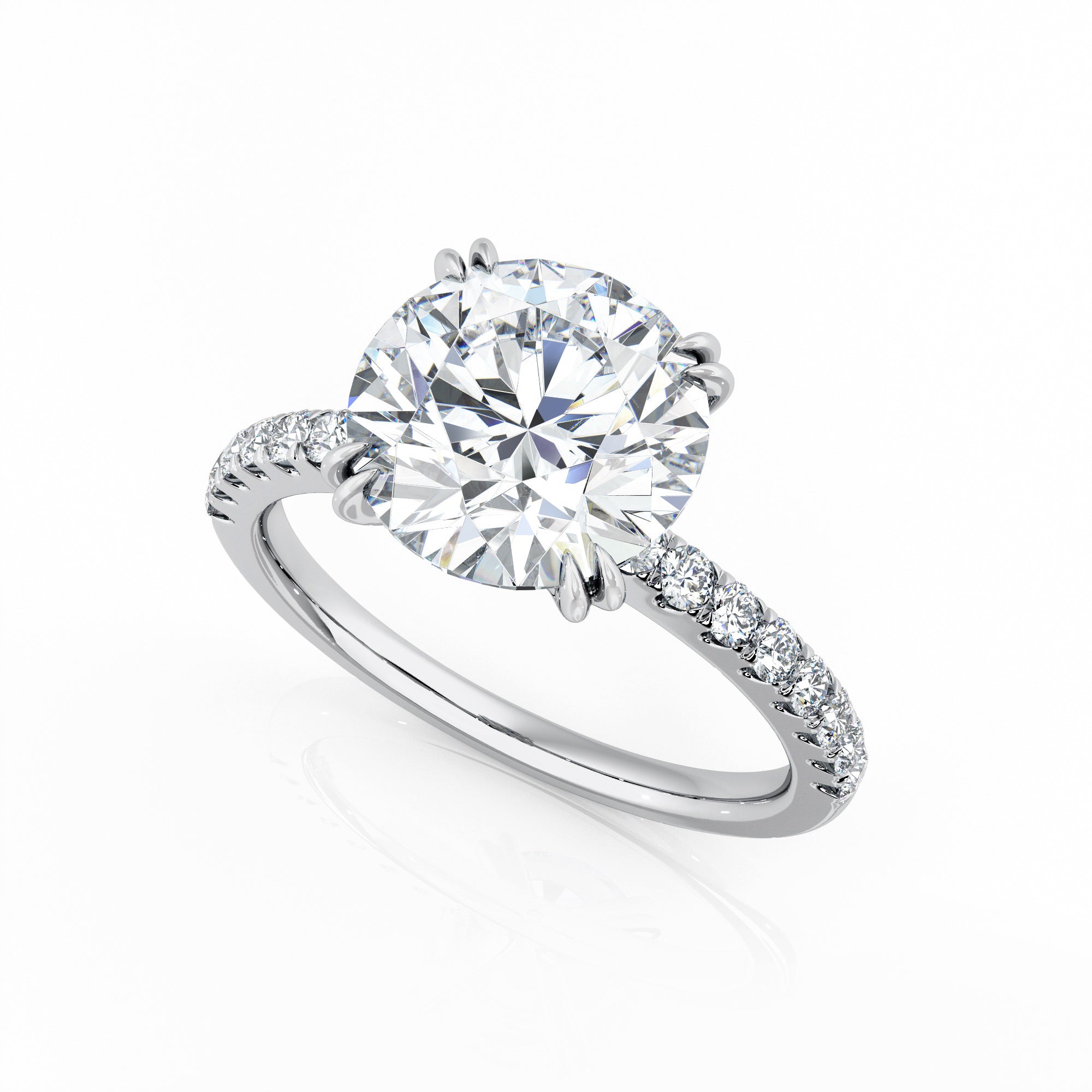 This timeless solitaire engagement ring showcases a stunning 2.00 carat round brilliant cut diamond set in sleek double eagle claws and complimented by a diamond studded band totalling 0.50 carats. The perfect choice for the most glamorous of women.