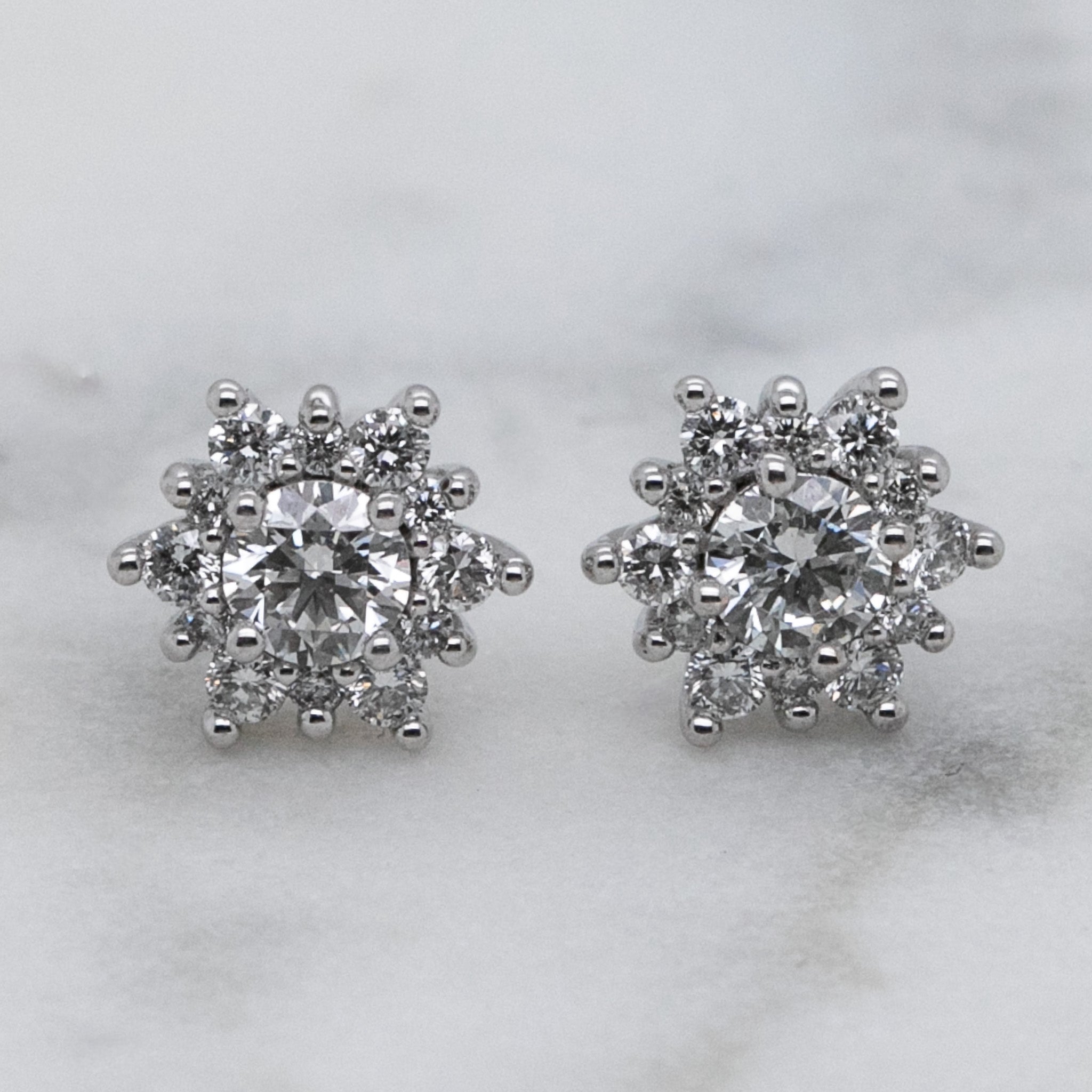 Radiating timeless elegance with a cosmic twist, these celestial cluster earrings capture the brilliance of the night sky. Each earring features a large round lab-grown diamond at the centre, encircled by a starburst of smaller lab-grown diamonds that amplify the sparkle from every angle. The 1.00ct total diamond weight ensures dazzling presence, while the finely crafted 18ct white gold setting enhances the icy brilliance of each stone.