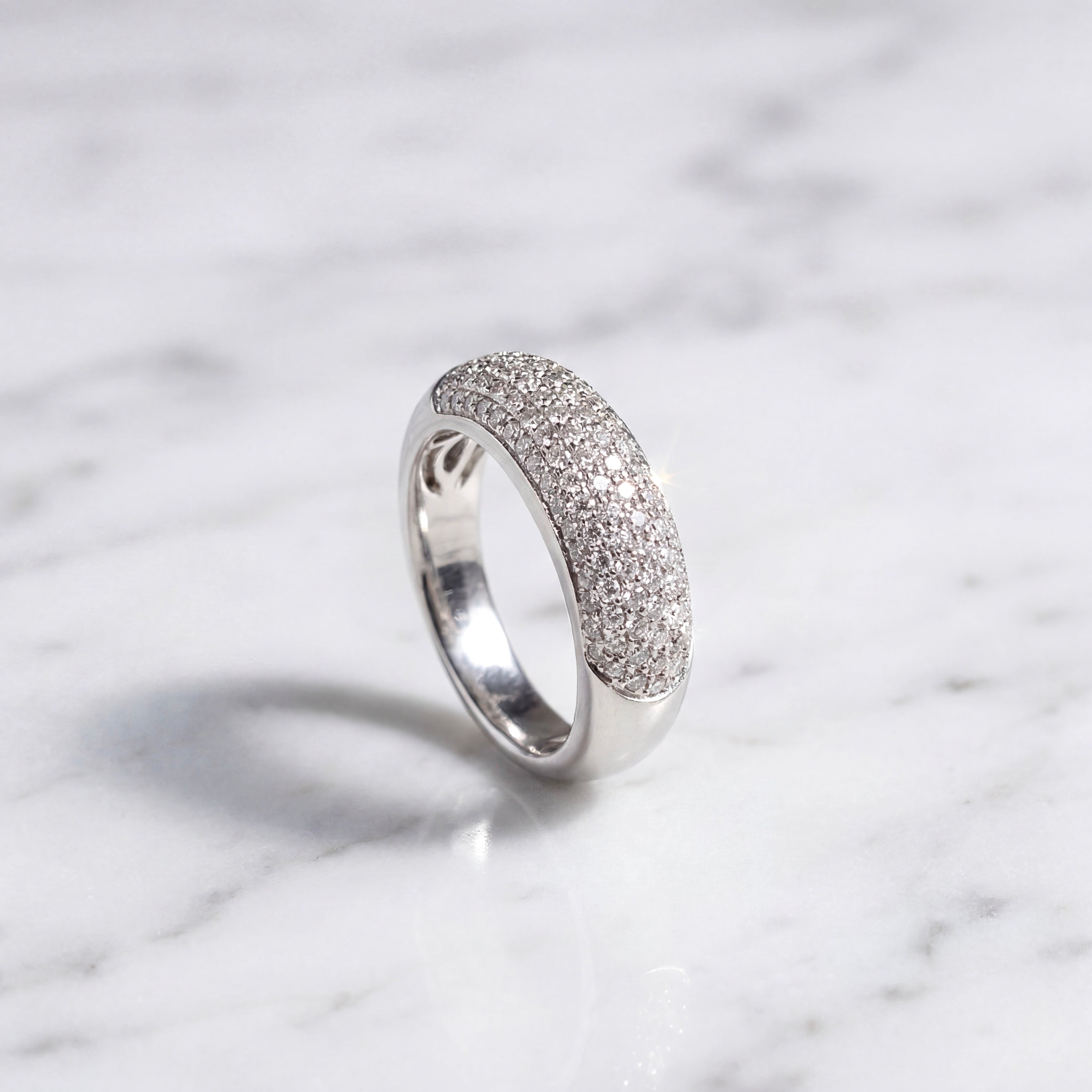 With a total diamond weight of 0.70ct, the closely set stones form a continuous surface of brilliance across the curved top of the ring, enhancing its sculptural form and contemporary elegance. A versatile design, it offers both statement and sophistication, perfect for everyday luxury or special occasions.