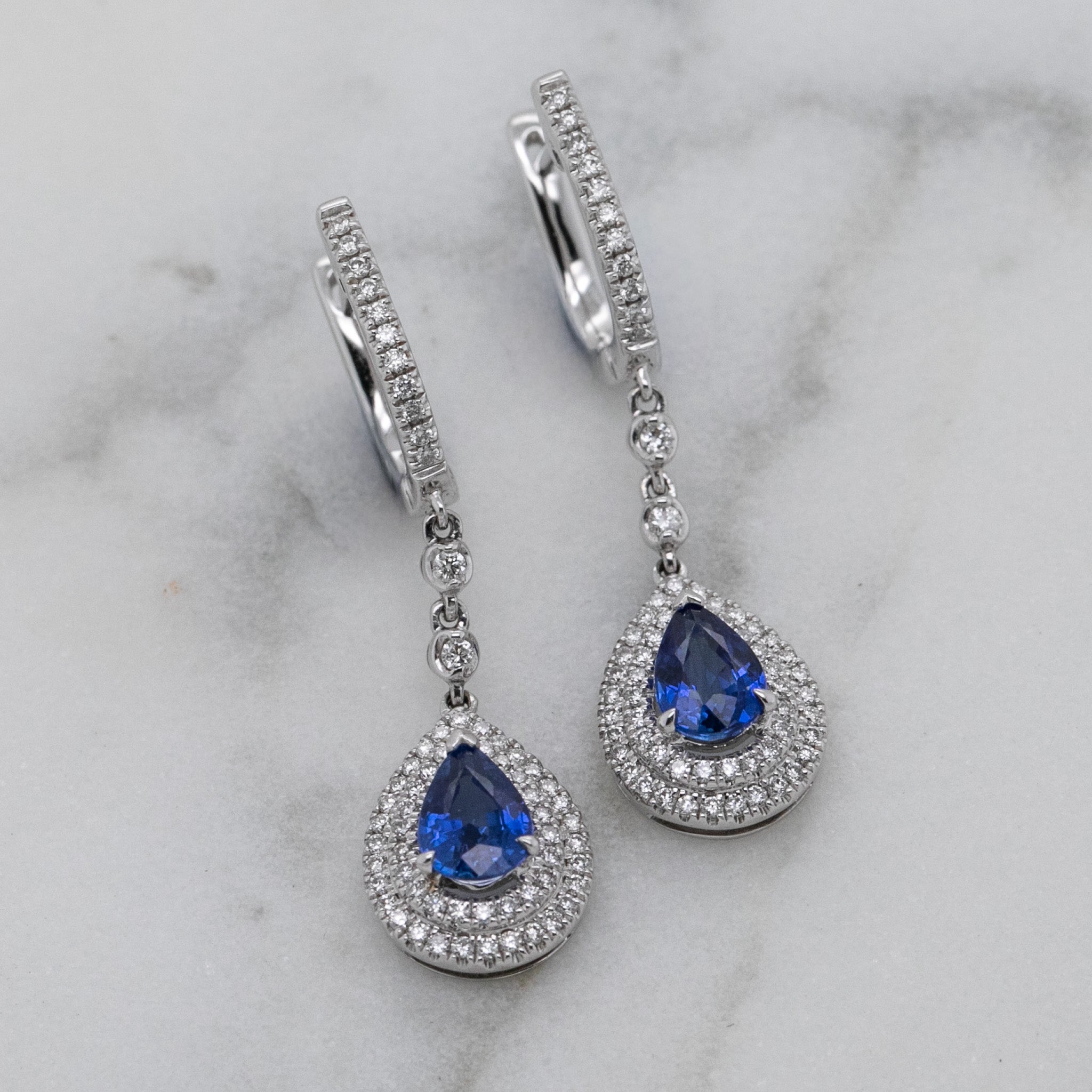 Featuring two pear-shaped royal blue Ceylon-type sapphires totalling 1.33ct, these vivid gemstones radiate depth and richness, beautifully complemented by the crisp brilliance of diamonds. Each sapphire is framed in a shimmering diamond halo with additional diamond detailing to enhance sparkle and elevate the silhouette.